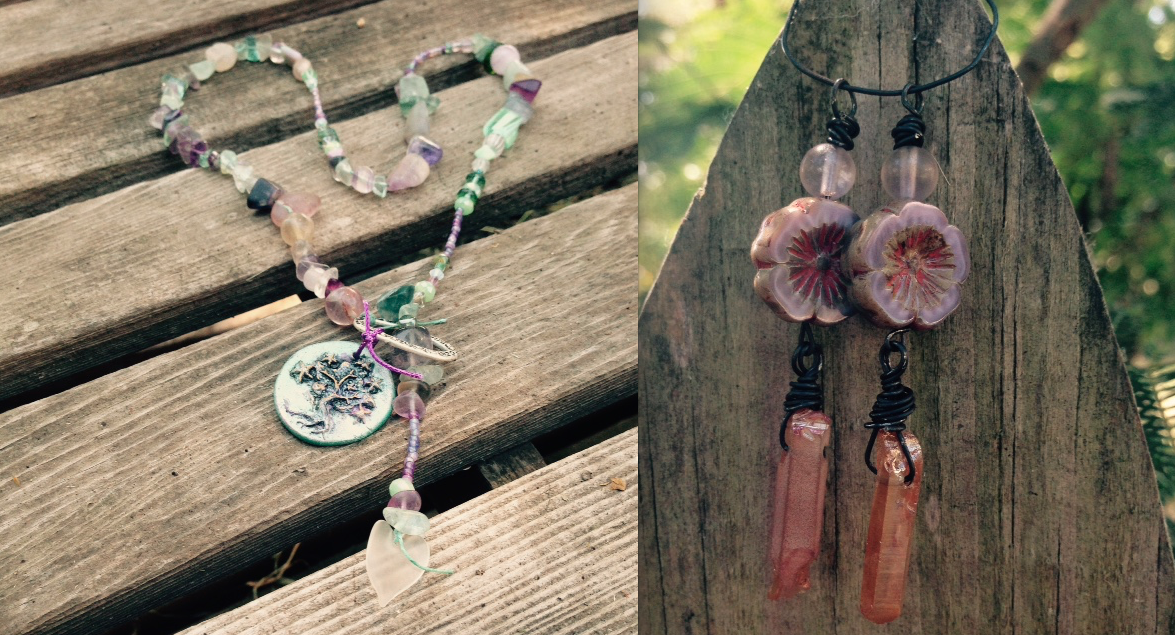 These pieces were made by Valerie Tilghman. Here's what she had to say about them: "I love fluorite! It's a soft stone but has such an amazing display of color. Such a wonderful gift from Mother Earth! Being that it is such a soft stone, using fluorite in a necklace lowers the risk of damage to the stone and allows everyone to see up close how beautiful they are. I used the lovely artwork made with the loving hands of Andrew as a focal for a bracelet. Being able to see it on the wrist will always remind us of how strong we are as a tree and all of the twists and turns that life brings are the branches. Last, but not least, the earrings! The center beads with the burst of color just screamed earrings! Paired with the lavender and hematite accents I look forward to wearing my favorite colors."